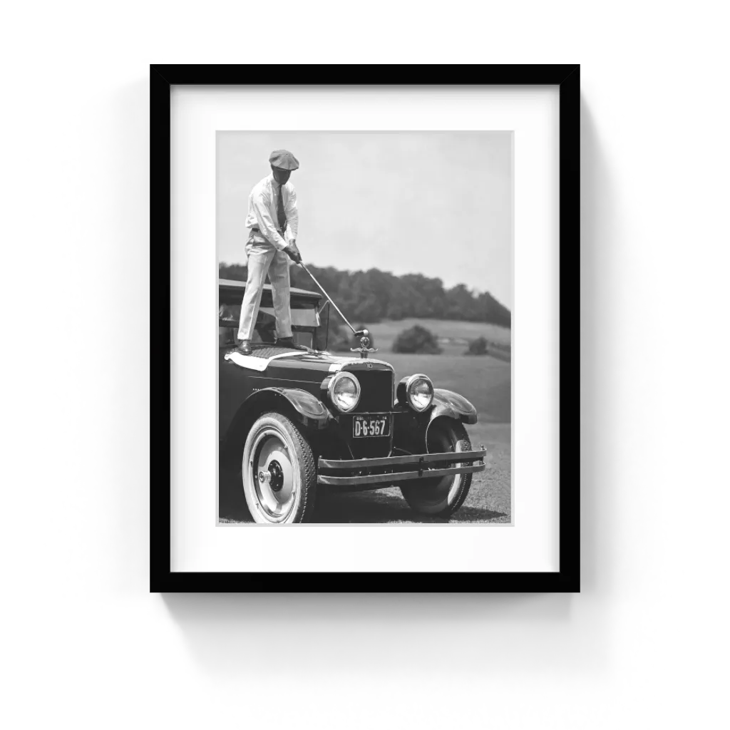 Man Playing Golf On Top Of Car, Funny Golf Art, Vintage Black and White Old Photo Art Print