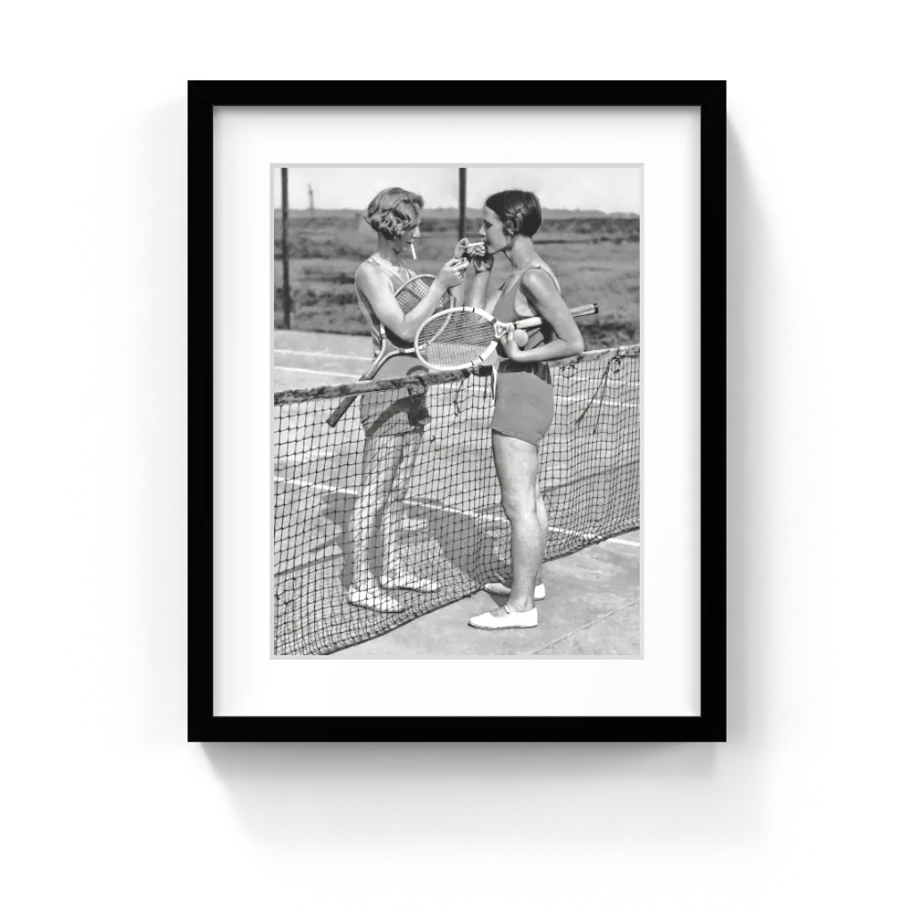 Two Women Playing Tennis Vintage Black and White Photo Art Print